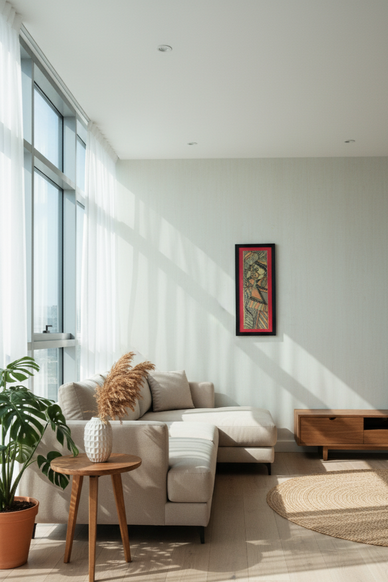 This exquisite artwork is created using natural colors and fine linework on handmade paper, enclosed in a premium black wooden frame with a vibrant red mount, perfect for adding an ethnic aesthetic to your living room, hallway, or office.