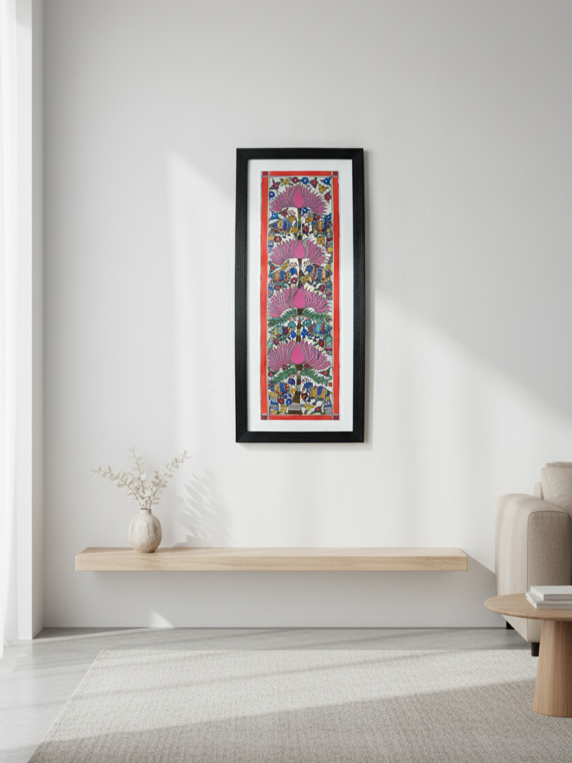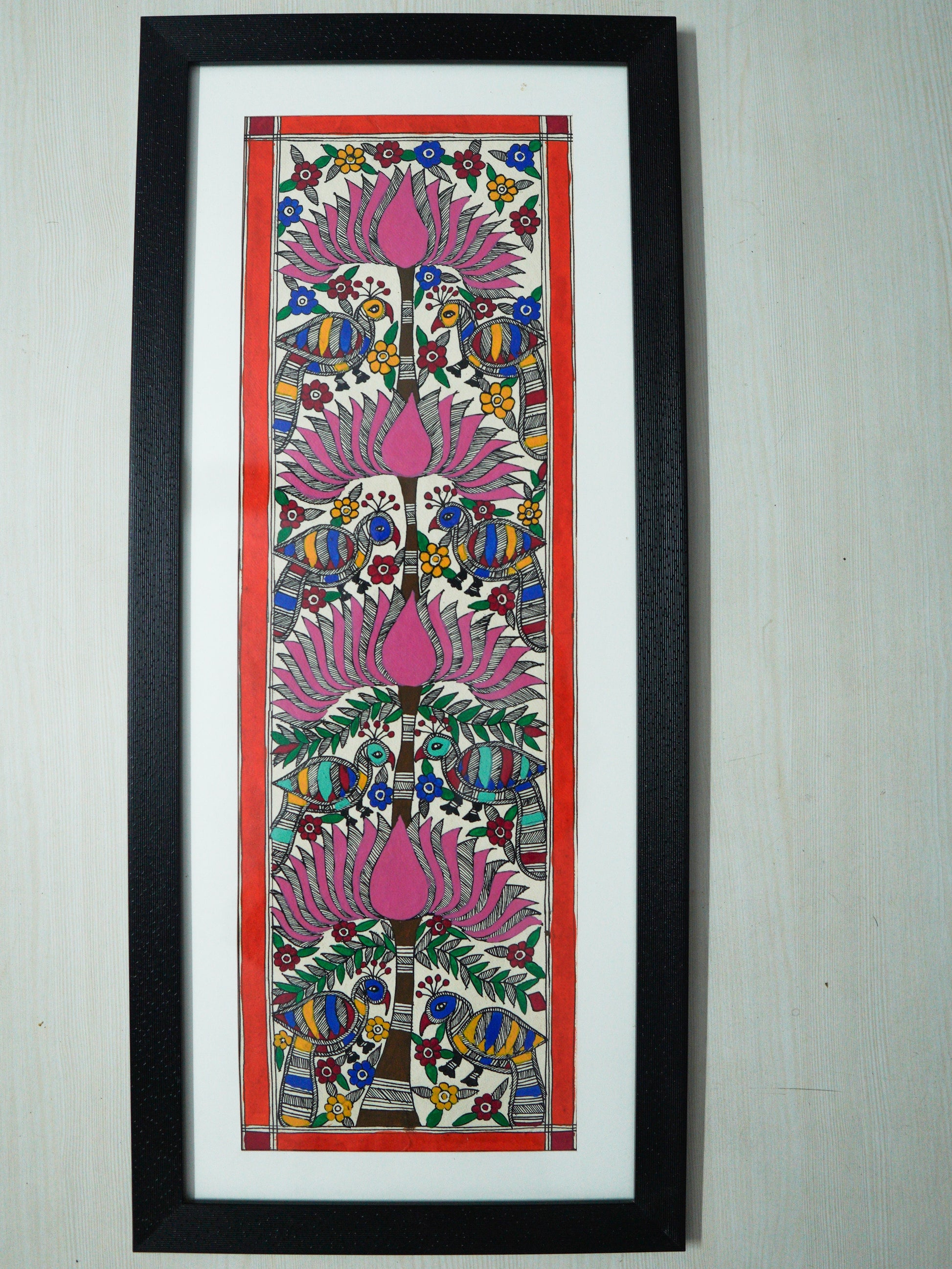 Handmade Madhubani Painting of Birds and Lotus | Traditional Indian Folk Art | Framed Wall Décor