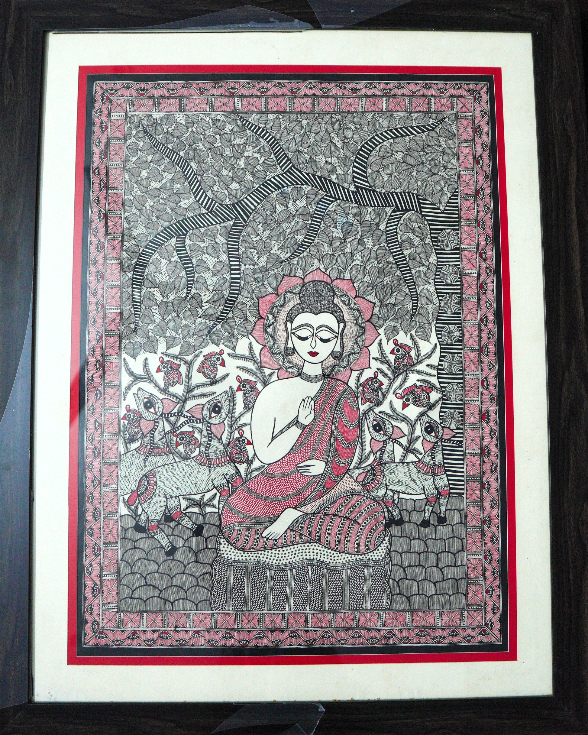 Handmade Madhubani Painting of Lord Buddha Under Bodhi Tree – Traditional Indian Folk Art