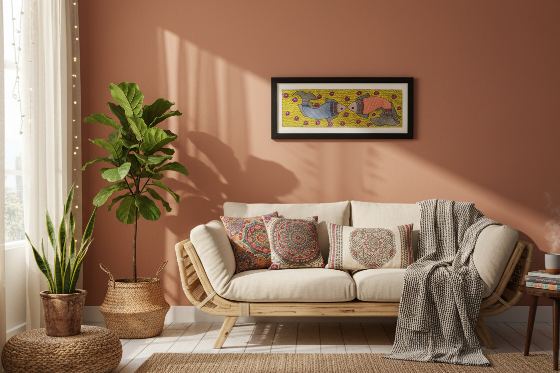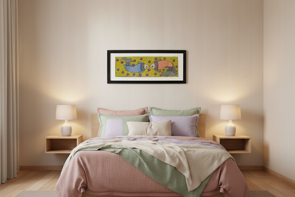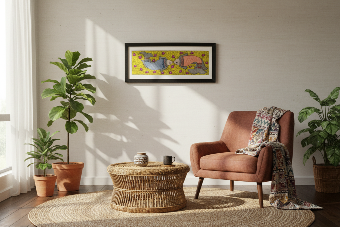 Bring home the vibrant charm of Indian folk art with this Handmade Madhubani Fish Painting, crafted with intricate detail and vibrant natural colors. This artwork depicts two fishes facing each other, representing balance, love, and prosperity — key themes in Madhubani tradition.