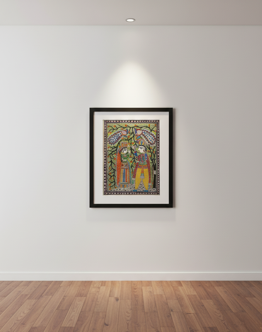 Handmade Madhubani Painting of Radha Krishna with Peacocks – Traditional Indian Folk Art Wall Décor